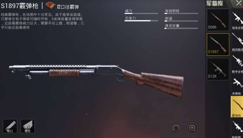 第二把推荐的是S1897,它是单人排位时最强的武器。在装满了弹匣以后,只需要零点五秒钟就能够全部打空了,这个射击速度会让其拥有击杀满血的效果。而且该枪械单发的伤害也非常高,玩家在情况不好的时候,可以躲在掩体的后面。等到时机成熟之后,再露头对敌人打出一枪,再迅速将头收回来,这种消耗方式敌人肯定扛不住。