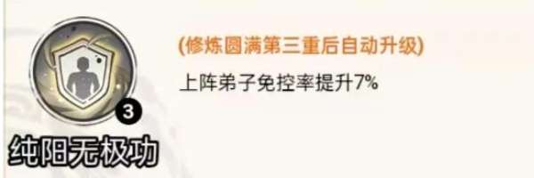 纯阳无极功属于掌门功法,在掌门洞府后天功法可查看、升级,无需佩戴,上阵弟子免控率提升5%,升级满后免控率提升10%,活动结束依然有效。