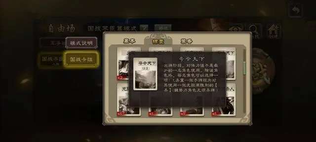 克复中原是蜀国的势力锦囊,相比于号令天下,我认为它更符合势力锦囊这样的称呼。克复中原的效果非常好理解,是一个类似于群体增益属性的锦囊。你选择任意名大概是你们阵营的角色,然后各自选择一个对自己有益的效果。现在国战的势力锦囊是会在牌堆第二次洗牌的时候才会加入,导致号令天下受到了巨大的影响。