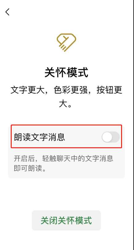 3、最后在此页面开启关怀模式后点击朗读文字消息后的按钮即可成功开启,开启后大家只要轻触聊天中的文字消息就能朗读了。