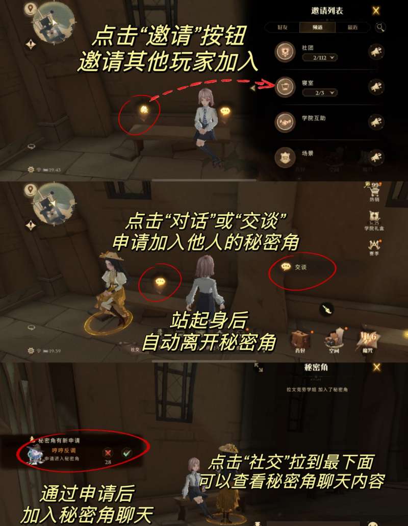 秘密角是一个类似帐篷的私密小空间,外面无法看见秘密角内的交谈内容(自动转换成可爱的表情文字),只有加入秘密角才能加入聊天(一个特定场景下的隐藏的聊天频道)。