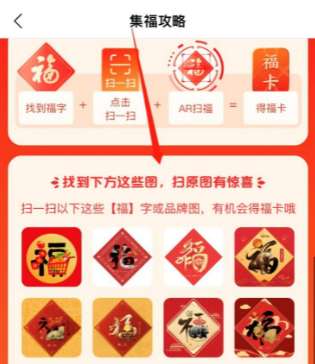随后,在攻略下方可以看到很多品牌商提供的福字,找到这些原图,使用AR扫描,更容易获得敬业福哦。