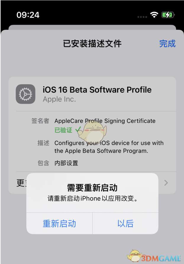 3、系统将提示您安iOS Beta配置文件,点击安装,然后输入密码,在接下来的对话框中均点击安装,按提示重启设备。