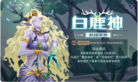 活动内容:活动期间,免费使用神系新英雄【白鹿神】,可以通过主界面的“冒险模式”或“梦魇模式”来进行游戏;“冒险模式”最高可挑战困难Ⅲ难度。