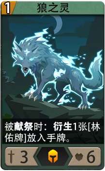 -狼之灵(卡组初始),1费3攻6血,被献祭时:衍生1张[林佑牌]放入手牌。