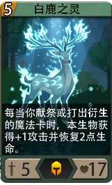-白鹿之灵,5费5攻17血,每当你献祭或打出衍生的魔法卡时,本生物获得+1攻击并恢复2点生命。