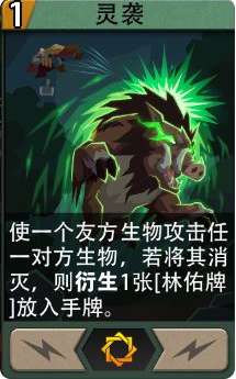 -灵袭(卡组初始),1费魔法卡,使一个友方生物攻击任一对方生物,若将其消灭,则衍生1张[林佑牌]放入手牌。