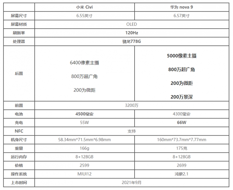 两款手机都是才用骁龙778处理器,能够为用户们带来强大的性能体验。区别是华为Nova9是不支持5G网络的,而小米civi则有5G网络。