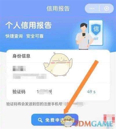 3、在信用报告页面里点击“发送验证码”,再把手机接收到的验证码填入后点击下方的“免费申请查询”。