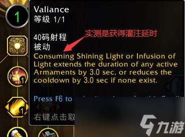 小点天赋在获得神圣灌注时延长已激活的军备3秒持续时间(可以超出原本的持续时间),在16%急速下通过敲钟、太阳花+消耗灌注减震击cd、晨辉3连发等手段也可以续到2分钟——如果战斗时间无限长,你甚至可以给所有人挂上军备!