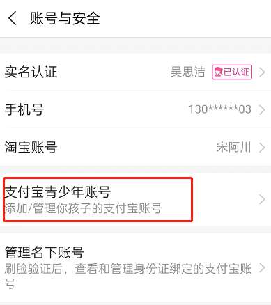 3、点击支付宝青少年账号。