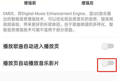 4、将播放页自动播放音乐影片右侧开关开启即可。