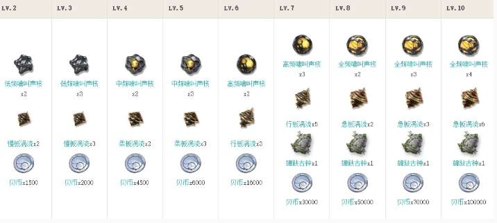 4、四阶突破:高频啸叫声核x4、妙弋花x12、哀歌声核x9、贝币x20000