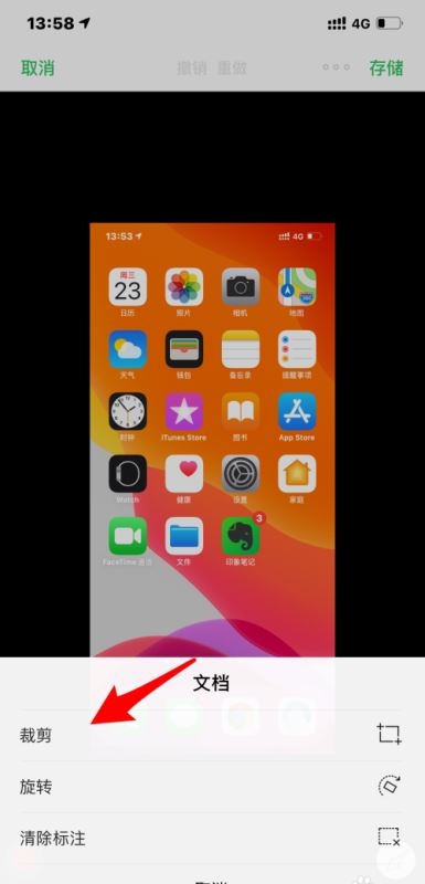4、在弹出的操作选择菜单中,点击选择“裁剪”