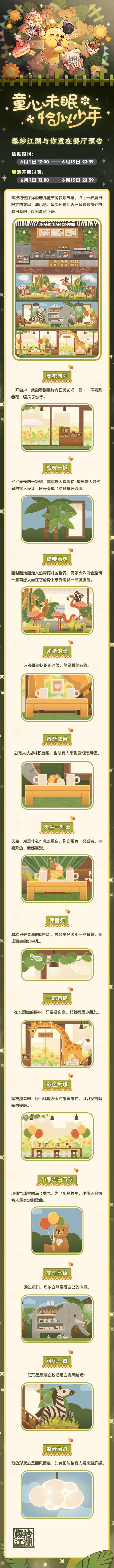 上图就是爆炒江湖儿童节主题餐厅预告内容啦,你对此次六一版本与你童在主题餐厅样貌满意吗?欢迎在评论区里留言哟。