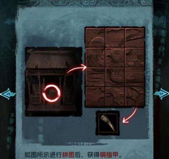 第14步:在仓库角落的“神龛”中有一个“拼图机关”盒子,根据如图所示的“拼图”后,可以获得“铜指甲”;