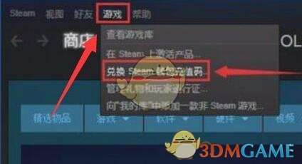 2、购买后,打开steam,点击“游戏”,选择“兑换steam钱包充值码”