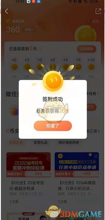 2、系统会自动提醒我们签到成功并领取了相应的c币。