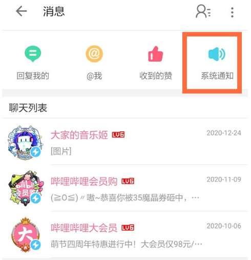 1、打开哔哩哔哩APP,点击首页右上角的信封图标。