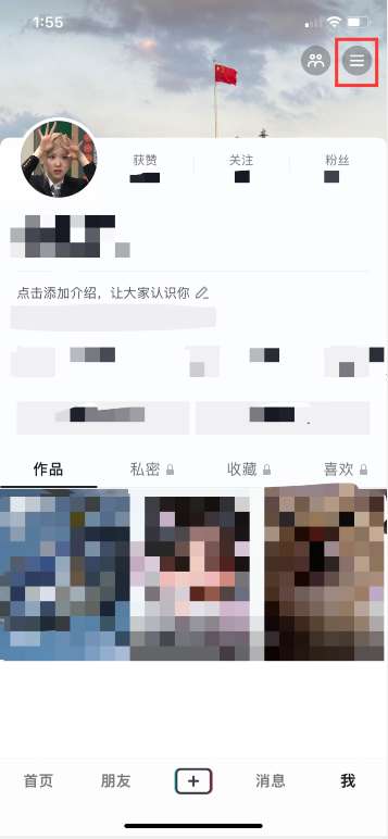 1、开启抖音短视频app,从我界面中点击右上角三条线的图标。