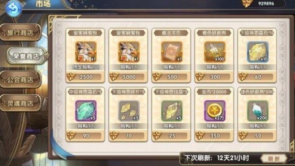 3、公会商店需要加入公会提升贡献值,各类宝石、召唤卷轴和魔法书页可以看需求来购买;