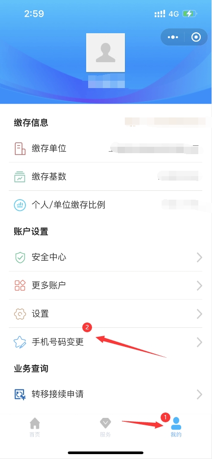 2、点击“我的”,找到“手机号码变更”功能