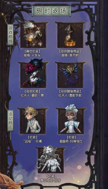 【稀世时装】前锋火车头、【奇珍随身物品】前锋-蒸汽炉、【奇珍时装】红夫人-最后一舞和【奇珍随身物品】红夫人-毒蛇手杖将限时返场,上架商城。