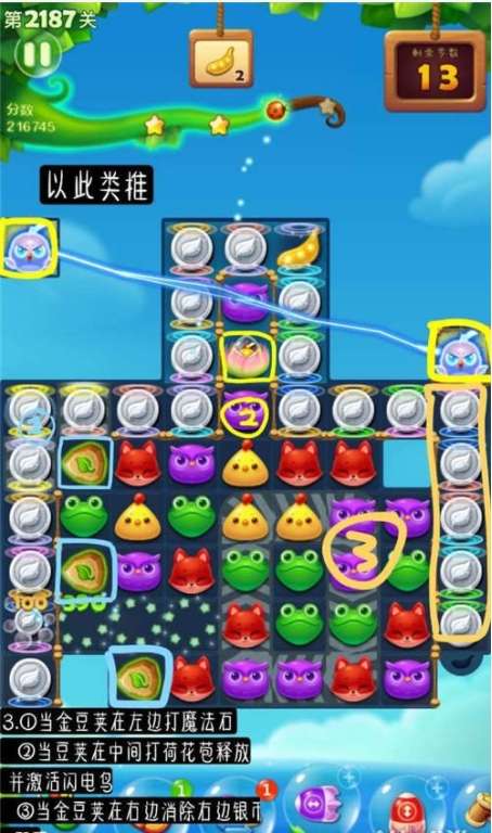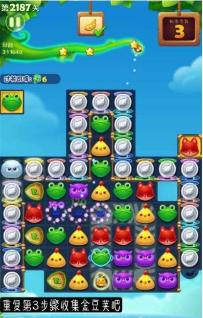 想要通过开心消消乐2187关,是比较简单的。完成条件是在29步之内收集4个金豆荚,对我们来说,最重要的就是合理使用这29步,争取上每一步都用到关键的地方,还要尽可能多的换出魔力鸟这样的强大特殊技能。