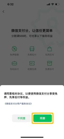 6、最后仔细阅读并勾选服务协议,同意相关条款后,输入你的支付密码进行验证,即可成功开通微信支付分。
