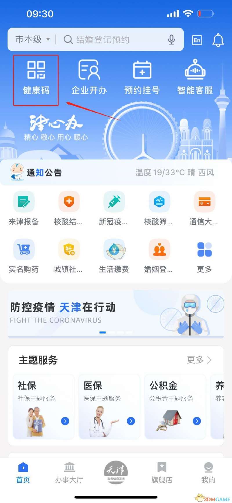 1、在津心办点击首页最上方的【健康码】