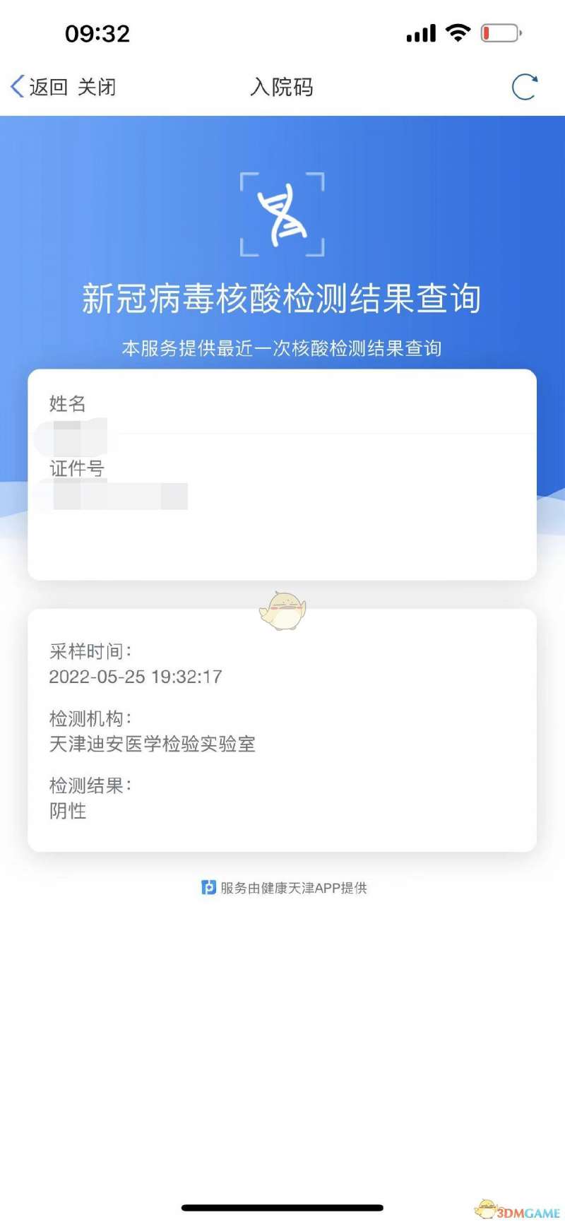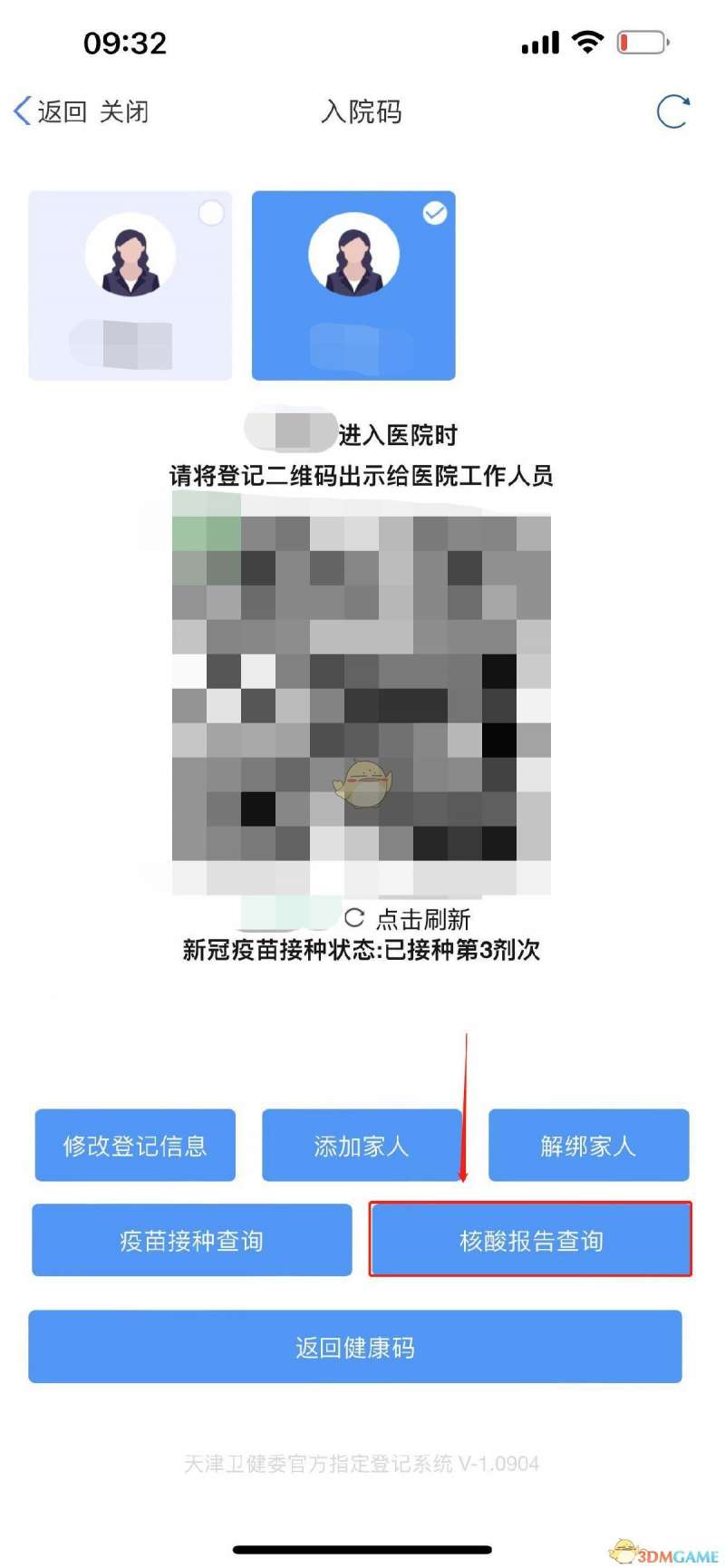 5、回到“入院码”界面。在最上方切换家人信息,点击“核酸报告查询”