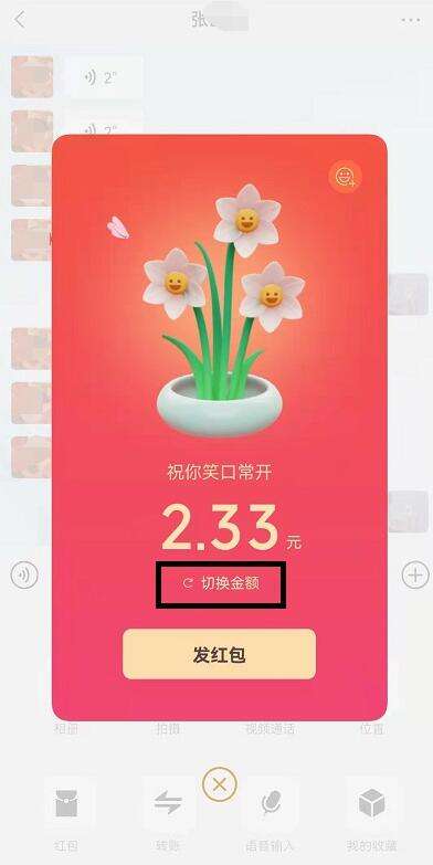 3、点击后会弹出拜年红包的动态效果和随机生成的红包金额,可以点击金额下方的【切换金额】换不同的红包金额,也可以直接点击【发红包】,发给好友拜年红包。