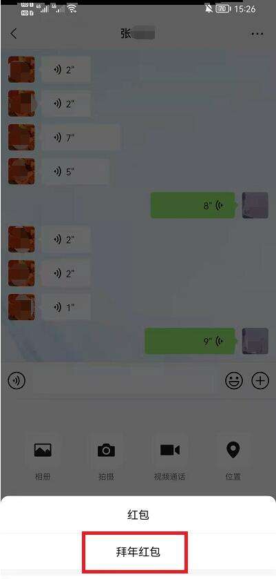 2、然后,在聊天界面打开发红包功能,点击红包,就会弹出红包和【拜年红包】,点击拜年红包;