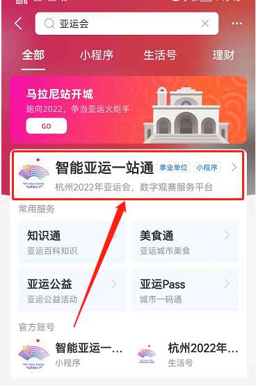 1、在支付宝首页点击上方搜索“亚运会”,点击进入小程序。