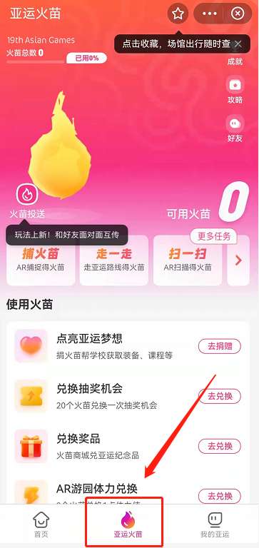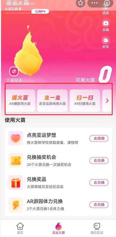 4、在亚运火苗首页点击一种获得方式,完成相应任务就能获得火苗啦~