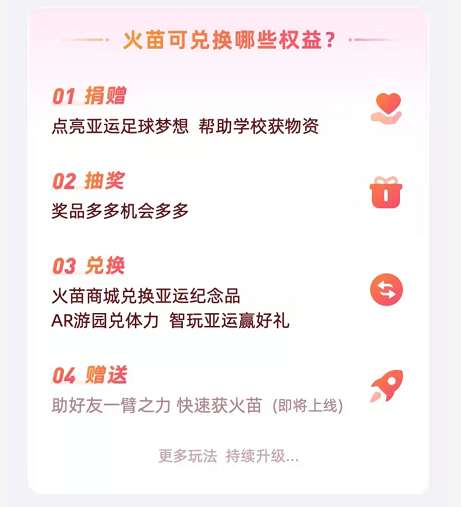 获得亚运火苗后用户们可以用于捐赠,帮助学校获取物资、参与抽奖以及兑换亚运纪念品。
