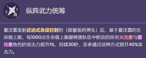 夏沃蕾将在队伍中附近的角色触发超载反应时获得1枚「超量装药弹头」。至多同时持有1枚「超量装药弹头」。