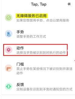 3.此时会出现“无障碍服务已开启”的提示。然后设置一个双击手机背部时要实现的操作。点击【动作】,在打开的页面中点击底部的【添加动作】按钮。