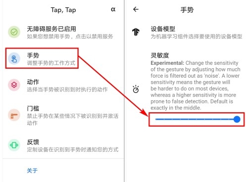 7.点击【手势】,可以调整双击背部的方式和灵敏度,如下图所示: