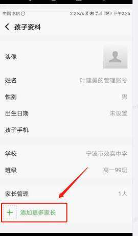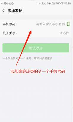 3.输入令一位家长的手机号码并选择相应身份,先假设是爷爷。