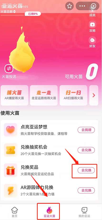2、进入小程序后点击亚运火苗板块,在这可以看到自己的火苗数,点击下方使用火苗中的兑换奖品进入。