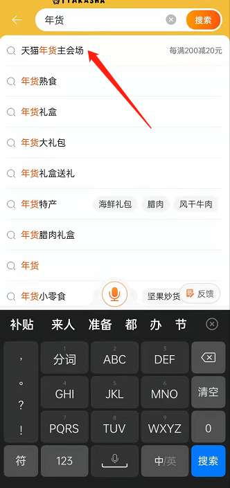 1、点击软件,选择搜索,找到【天猫年货主会场】。