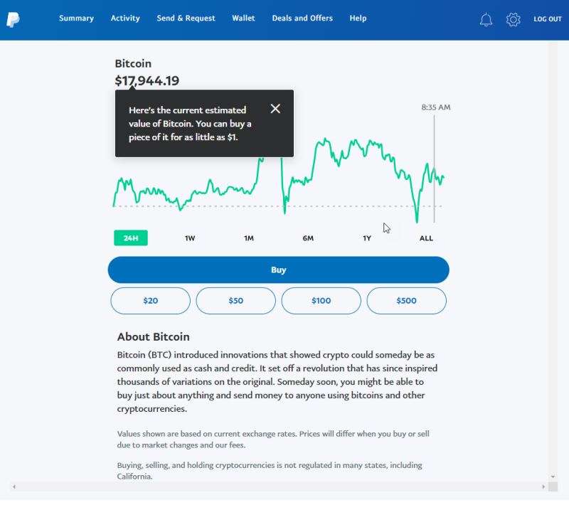 3、接下来,选择您想要购买的加密货币。目前,在PayPal上买卖的选项是比特币,以太坊,比特币现金或莱特币。此外,PayPal还提供了学习加密货币的资源;它还列出了涉及的风险。