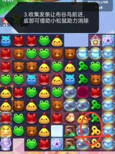 3、三消收集发条并突破魔法罐,底部雪块可借助小松鼠消除,让布谷鸟畅行。