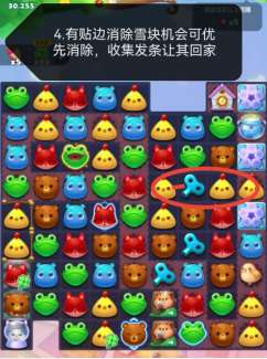4、消除右侧布谷鸟回家道路上的雪块,有贴边消除雪块机会可优先消除,中间区域三消收集掉落的发条,让布谷鸟行回家。
