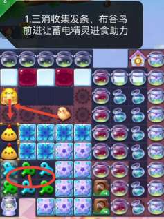 1、三消收集发条,布谷鸟行进将蓄电精灵挤下来进食,助力消上方雪块与毒液。