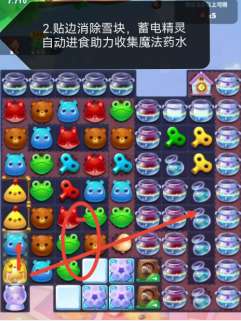 2、左侧可贴边三消消雪块,蓄电精灵借助传送阵自行进食助力,收集魔法药水点亮魔法罐。