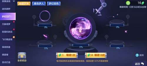 3、梦幻工厂主要是锻造的,锻造有几率会抽到皮肤等奖励,锻造进度达到100%的时候可以直接领取。
