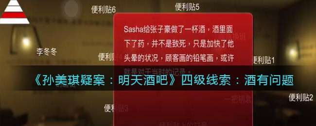 孙美琪疑案明天酒吧是一款解谜探索的冒险竞技游戏,游戏中四级线索——酒有问题需要关联6个线索,分别是:Sasha+C桌顾客口供+张子豪+铅笔画+马鸥+药瓶。下面是十大评测网小编给大家带来的《孙美琪疑案:明天酒吧》酒有问题线索获取位置介绍,还没有找到线索的小伙伴一起看看吧!