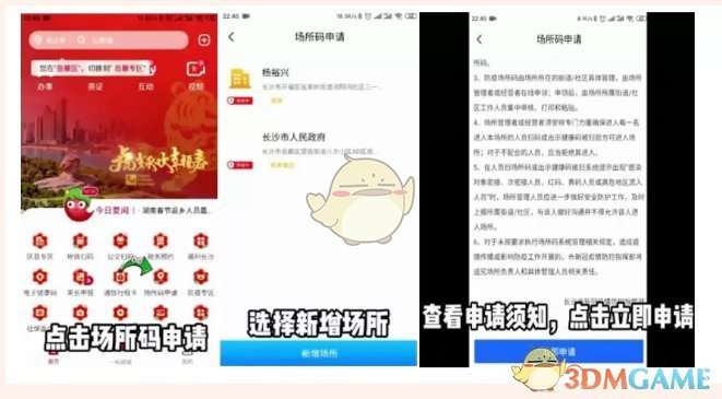 场所管理员通过“我的长沙”APP,在首页点击“场所码申请”,选择“新增场所”,查看“申请须知”后,点击“立即申请”。